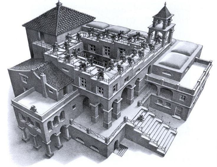 When we are satiated with food and drink; when our environments are safe; when our bodies are healthy, and free from disease, then Dualism invariably sets in. It is no coincidence that the proliferation of bizarre beliefs which result from Dualism coincides with levels of affluence in a society. With either too much Certainty, or too little Certainty, in yourself, in others, and in your environment, then often Logic deteriorates and pure Affect reasserts itself (Hedonism). This entire process is all summed up in the concept of the Strange Loop.